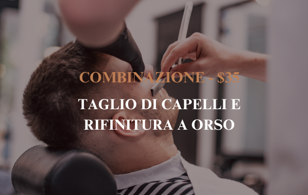 Servizio Servizio Add Your Heading Text Here Tagli Taglio classico € 15 Scatena il tuo stile con i nostri tagli di precisione: è tutta una questione di dettagli. Taglio BUzz € 25 Taglio completo con macchinetta, rifinitura dell’attaccatura dei capelli e finitura con asciugamano caldo. Parte superiore piatta € 38 Scatena il tuo stile con i nostri tagli di precisione: è tutta una questione di dettagli. Scultura della barba € 17 Scatena il tuo stile con i nostri tagli di precisione: è tutta una questione di dettagli. Prenota appuntamento si rade Rasatura del viso € 15 Rasatura con rasoio a mano libera su guance e collo per una finitura pulita. Rasatura della testa € 25 Rasatura con rasoio a mano libera su guance e collo per una finitura pulita. Baffi / Pizzetto € 38 Rasatura con rasoio a mano libera su guance e collo per una finitura pulita. lucidare € 17 Ceretta, rifinitura e sistemazione delle sopracciglia. Prenota appuntamento